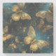 Ein eleganter Untersetzer aus Stein mit einem Schmetterlingsmuster in glitzernden goldenen Farbtönen und leuchtender Blues.