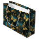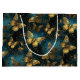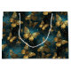 Eine elegante, große Geschenktasche mit einem Schmetterlingsmuster in glänzenden goldenen Farbtönen und leuchtender Blues.