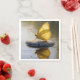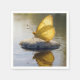 A golden butterfly perches delicately on a rock in the middle of a serene water body, its intricate wings beautifully illuminated by soft lighting, creating a graceful reflection
