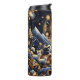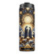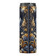 In einer stilisierten, verzierten Darstellung der Krippe, Maria und Joseph in dunklen Roben mit goldenem Halos-Kneel vor dem leuchtenden Säugling Jesus in einem Manöver. Sie sind umgeben von sanften Schafen, knienden Engeln, und erstaunlich gestaltetem Blattwerk in Goldtönen, Blau und Weiß. Oben entfaltet sich eine Himmelsszene mit einem strahlenden Mond, Sternen und wirbelnden kosmischen Mustern gegen einen tiefblauen Nachthimmel, gerahmt von majestätischen, stilisierten Bergen und Weihnachtsbäumen.