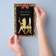 Ein glamouröser Flyer mit einer goldenen Krone für den Friseursalon. Der Hintergrund ist mit einem schicken Leopardenprint in Schwarz und Gold und einem gürtelroten Bogen geschmückt. Nutzen Sie für jede besondere Veranstaltung. Flachdruckbild, NICHT metallisch, und nicht eigentlicher Bogen.