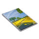 Golden Fields and Path captures a peaceful countryside road where vibrant yellow fields meet deep, long tree shadows under a soft blue sky.