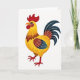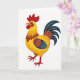 This card features a stylized rooster centered on a bright white background, drawn with sharp contours and broad areas of smooth color. Its body is golden-yellow, with a scarlet comb and wattle that echo the red of its sturdy feet, giving it a proud, affectionate “look at me” stance that can feel like a friendly wink. Rich browns and deep blues shape the neck and wing feathers, adding depth while keeping the overall look simple and graphic. The tail fans outward in curved plumes of indigo and russet, each one traced with a light edge that reads like a gentle touch between close friends. A short Easter greeting sits near the top in a soft gray tone, with a smaller line beneath it in muted red, leaving plenty of open space around the bird 🌷. The clean backdrop makes the colors stand out and keeps the focus on the rooster’s confident pose 🐇. The indigo tail feathers arc to the right in layered curves, with thin highlights following each plume’s sweep.