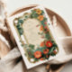 Ein beeindruckendes Hochzeitsdesign, das von einer goldenen Vintagen Grenze gerahmt und mit einer üppigen Kaskade von Sommerfloralen in Rot-, Orange- und Pfirsichtönen geschmückt ist. Inspiriert durch klassische botanische Illustrationen und verzierte Stilelemente aus dem 19. Jahrhundert verbindet dieses Stück Eleganz und natürliche Lebenskraft - ideal für Gartenfeiern oder Feiern im Freien mit zeitlosem Flair.