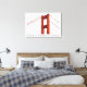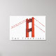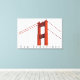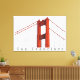 Ein nahes Foto erfasst den ikonischen roten Turm der Golden Gate Bridge. Die aufwändige Struktur des Turms mit vertikalen Stützen und horizontalen Balken ist sichtbar. Die Seile der Brücke, die aus zahlreichen dünnen Drähten bestehen, erstrecken sich vom Turm und bilden ein Muster vertikaler Linien vor dem weißen Hintergrund.