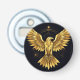 Ein atemberaubendes Bild eines goldenen, aufwändig konstruierten geometrischen Adlers mit ausgestreuten Flügeln, der vor einem abstrakten dunklen Hintergrund mit mystischen Mustern positioniert ist. Ideal für Themen wie Stärke, Power und Freiheit.
