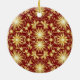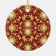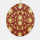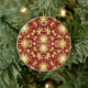 This ornament features a striking pattern of radiant gold starbursts arranged on a deep red background, creating a warm and festive holiday look. The bright golden shapes resemble twinkling Christmas lights and sparkling winter stars, giving the design a glowing, celebratory feel. Small floral elements and delicate detailing add charm and elegance to the overall pattern.