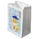 Begrüßen Sie Ihren Lieblings-Absolvent mit einem Geschenk in einer Tasche mit einem niedlichen, glücklichen Golden Retriever Absolvent mit einem Mörtel inmitten einer Flasche Konfetti.