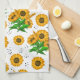 Ein wunderschön gestaltetes Küchentuch mit einem lebendigen Muster aus Sonnenblumen und Weizenblumen auf einem weißen Hintergrund. Die hellgelben Blumen, die üppig grünen Blätter und der goldene Weizen schaffen ein frisches und rustikales Ambiente und verleihen jeder Küche einen besonderen Charme. Dieses aus weichem und absorbierendem Stoff hergestellte Handtuch eignet sich hervorragend zum Trocknen von Geschirr, zum Abwischen von Tischdecken und zur Verbesserung der Küchendekoration.