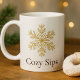 The Golden Hearth Cozy Sips mug features a gold snowflake accent paired with cocoa brown serif text. Its warm holiday palette adds a seasonal touch to morning routines and winter evenings, making it an inviting piece for kitchen counters, coffee corners, and relaxed fireside moments.