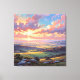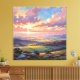 Artwork of some grassy plains and hills lit up by golden sunshine. The sky explodes in a symphony of warm hues – fiery oranges and soft pinks dance with gentle blues and purples, casting a radiant glow upon the serene valley below. Wispy clouds, brushed with golden light. The landscape unfolds in layers of gentle slopes and lush green fields, dotted with patches of trees and hints of distant villages. The foreground features clusters of wildflowers in delicate shades of pink and blue, nestled among smooth, grey stones, inviting the viewer to step into this peaceful scene. A perfect addition to any home seeking a touch of natural beauty and tranquility. This artwork can be customized, printed, and downloaded.