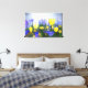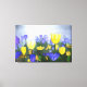 Sonnige, gelbe und blaue Tulpen ragen an einem coolen Frühlingmorgen auf einem Feld hervor. Im frühen Sonnenlicht sehen sie sich wie goldene Tassen des Lichts aus.