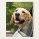 Sonntag Fahrt durch Land, auf baumbedeckte Schotterstrasse mit Labrador Retriever. Hund hat seinen Kopf aus dem Fenster und sieht glücklich aus, reiten zu gehen und scheint zu lächeln.