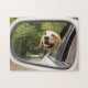 Sonntag Fahrt durch Land, auf baumbedeckte Schotterstrasse mit Labrador Retriever. Hund hat seinen Kopf aus dem Fenster und sieht glücklich aus, reiten zu gehen und scheint zu lächeln.