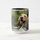 Sonntagsfahrt durch das Land, auf einer Baumstraße mit Labrador Retriever. Hund hat sein Kopffenster und sieht glücklich aus, zum reiten zu gehen und scheint zu lächeln.