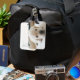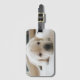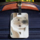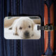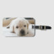Das Closeup-Bild eines müden, 2 Wochen alten, auf einem weißen Teppichboden liegenden Hundewelpen, der auf einer Kamera liegt