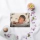 Elegante Geburtsankündigungskarten verfügen über ein vollblutendes, horizontales oder landschaftsorientiertes Foto mit einem Overlay von Lorbeerblättern in Rose-Goldfolie. Personalisieren Sie Ihre persönlichen Daten mit dem Namen des Babys, den Geburtsstatistiken und einer Familiensignatur, die in weißen Schriften überlagert ist, und fügen Sie drei zusätzliche Fotos hinzu.