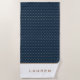 Holen Sie sich Ihr personalisiertes Badetuch für ein elegantes Aussehen mit prächtigen goldfarbenen und silbernen Ankern auf marineblau-blauem Hintergrund. Monogramm ist auf einem weißen Rand unten in Sans Serif Gold Schriftart.