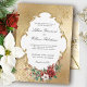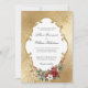 Erleben Sie eine unvergessliche Winterhochzeit mit diesem eleganten Urlaubskonzept, das ein üppiges Gewirr von Weihnachtsliedern, Poinsettia, Heilig und Kiefer, ein weiße Etikett mit verziertem Goldrahmen und einem opulenten Imitat aus metallischem Goldgradientengefälle mit Damast-Mustern bietet. Enthält ein benutzerdefiniertes Gold-Wappen mit Textfeldern.
