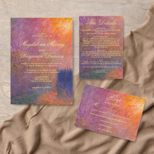 Bring timeless art and sophistication to your wedding with this romantic and moody jewel-tone design featuring a digitally enhanced version of Claude Monet’s painting, The Houses of Parliament, Sunset (1904). The original masterpiece has been artistically refined and color-enhanced to highlight sunset colors of golden orange, deep violet, and pink tones, creating a luxurious, elegant, and dramatic atmosphere for your celebration.