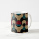 Retro-modern geometric abstract coffee mug featuring, bold circles, gold coloured accents, and rich tones on a distressed beige backdrop.