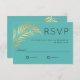 Eine Hochzeitskarte RSVP Im eleganten minimalistischen Stil mit einem Single golden Imitat Palm Frond über einem karibisch blauen Hintergrund. Ein zeitgenössischer Stil sans serif Art Gesicht wird verwendet, um den zeitgenössischen Stil des Designs zu ergänzen. Diese Antwortkarte eignet sich hervorragend für Hochzeiten am Strand, Hochzeiten in Urlaubsort oder Hochzeiten mit einem tropischen Thema.