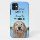 Dieser iPhone Fall kennzeichnet eine Fotografie eines lächelnden golden retrieverhundes, der durch blaue Himmel und Wasser umgeben wird. Das Zitat liest, "ließ Ihre Lächelnänderung die Welt."