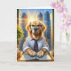 Ein anthropomorphisierter Golden Retriever sitzt hinter einem Schreibtisch in einem Hochhaus-Büro und trägt ein Shirt und eine Krawatte für den Boss's Day. Der Text kann geändert werden.