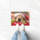Herzlich Willkommen auf Ihrer Zuhause in dieser Feriensaison mit dieser niedlichen Haustür! Das Design zeigt ein Foto eines Golden Retriever Hundes, der auf einem Kissen unter einem Weihnachtsbaum schläft und eine rote Weihnachtsmannmütze trägt. Der Text sagt "Happy Holidays!"