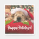Fügen Sie Ihren Feierlichkeiten in diesem Jahr ein wenig goldenen Beifall hinzu! Das Design zeigt ein Foto eines Golden Retriever Hundes, der auf einem Kissen unter einem Weihnachtsbaum schläft und eine rote Weihnachtsmannmütze trägt. Anpassbarer Text lautet: "Happy Holidays!"