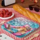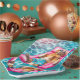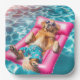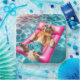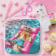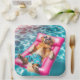 Eine goldene Retriever-Hundeliege auf einer rosa aufblasbaren Luftmatratze in einem Swimmingpool, die eine Sonnenbrille trägt, und blaue Badestühle mit rosa Blume