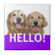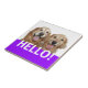 Sagen Sie hallo! Diese Keramikfliese kennzeichnet eine Fotografie von zwei lächelnden Hunden des goldenen Retrievers, mit dem Wort HALLO! in Lila.