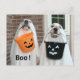 Auf dieser Postkarte befinden sich zwei goldene Retriever Hunde, die als Halloween-Gespenster gekleidet sind! Sie tragen weiße Blätter und tragen orange und schwarze Leckereien mit Jack-oder Laterne-Gesichtern. Der Text auf der Vorderseite liest "Boo!", während der Text auf der Rückseite lautet: "Leckereien Got? Happy Halloween!" Text ist vollständig anpassbar.