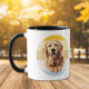 Ein Portrait eines Golden Retriever Hundes ist das Feature auf dieser Tasse. Das Bild wird auf einem Retro-Hintergrund mit leicht bedrücktem Gold, Bräune und blauem Streifen platziert und zweimal auf der Tasse gedruckt. Ihr Name ist in einem schwarzen Skript zwischen den Bildern.