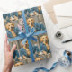Ein goldener Retriever Hund ist in einer stilvollen Jeans mit Denim-Jacke und zerrissenen Jeans gekleidet, die sich auf einem Kissen mit verschwommenem Hintergrund lockt