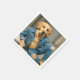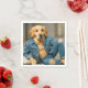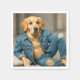 Ein goldener Retriever Hund ist in einer stilvollen Jeans mit Denim-Jacke und zerrissenen Jeans gekleidet, die sich auf einem Kissen mit verschwommenem Hintergrund lockt