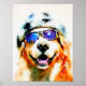 Dieses Poster zeigt ein lebendiges Aquarellbild eines lächelnden Golden Retriever Hundes, der eine zebragestreifte Sonnenbrille und einen Hut trägt.