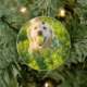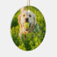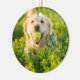 Decorative ceramic ornament with the image of a golden retriever in the fields and a ball in the mouth.