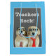Zeigen Sie Ihre Anerkennung für einen Lehrer, den Sie während der Lehrer-Anerkennungs-Woche kennen oder jederzeit an allen! Diese niedliche Geschenktasche kennzeichnet ein Paar Hunde des goldenen Retrievers, die als Lehrer "Nerds gekleidet werden," sind wer vor einer Tafel stehend. Der Titel liest, "Lehrer schaukeln!"