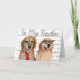Diese lustige Grußkarte zeigt ein Foto von zwei lächelnden Golden Retriever Hunden, die Krawatte und Nerd Brillen tragen. Der Hintergrund auf der Vorderseite ist ein Blatt Papier aus lockerem Blatt mit den Worten "To My Teacher", geschrieben in kursiver Handschrift. Im Text steht: "Danke für alles, was du tust!", aber das kann leicht geändert oder gelöscht werden. Perfekt für den Tag/die Woche der Lehrerbewertung im Mai.