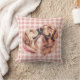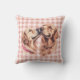 Two beautiful Golden Retriever dogs nuzzle each other on this adorable pillow. The dog images are placed on a faded pale pink gingham check pattern background. Both sides of the pillow have the same image. A cute gift for anyone who loves Golden Retriever dogs.