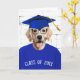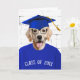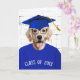 Golden Retriever Hund in einem blauen T - Shirt und Graduierdeckel mit schwarz-gerahmten Brillen auf Backstein Wand Hintergrund Graduierte gratulieren. Text ist bearbeitbar.