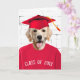 Golden Retriever Hund in einem roten T - Shirt und Graduierung Cap auf Backstein Wand Hintergrund für Graduate Gratulationen. Text ist bearbeitbar.