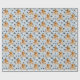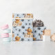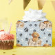 Ein bezaubernder Golden Retriever Welpe, der aus einem Korbweide-Wäschekorb herausschaut, ist das Merkmal dieses jeder Anlass Geschenkpapier. Das Portrait ist inmitten eines Musters aus schwarzen Pfoten und weißen Knochen, und wird auf einem silberblauen Hintergrund wiederholt. Ideal für jeden Golden Retriever Hundeliebhaber!
