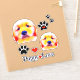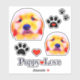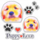 Hier ist eine Gruppe niedlicher und lebendiger Hundeaufkleber! Die Designs verfügen über zwei lebendige Kunstmalereien eines niedlichen, goldenen Retriever Welpen, die in Blau-, Gelb- und Orangetönen dargestellt sind, schwarze Pfoten, ein rotes Herz und den Ausdruck "welpe Liebe".