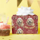 Das wiederholte Muster auf diesem hübschen Weihnachtsverpackungspapier ist ein Portrait eines schönen Golden Retriever mit einem rot-weißen Weihnachtshut. Zusammen mit den Hundebildern ist ein elegantes, passendes rotes Banner mit goldenen Designanhängern an der Spitze dekoriert. Ihr benutzerdefinierter Text ist in blassem Gold in drei Feldern, sodass Sie ihn anpassen können.