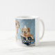 Diese Tasse kennzeichnet einen goldenen Retriever, der eine Tasse heißen Kakao trinkt, wenn der Kakao ein Welpe des goldenen Retrievers ist.
