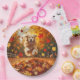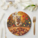 Ein goldener Retriever springt fröhlich in einen Haufen von bunten Herbstblättern und erzeugt eine lebhafte Explosion aus Rot, Gelb und Orangen