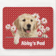 Niedlicher goldener Retriever mit weißen Gänsebläschen auf rot-weißem Polka-Punktmuster. Der Name kann bearbeitet oder gelöscht werden.