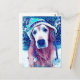 Diese Postkarte zeigt ein lebendiges blaues Kunstportrait eines Golden Retriever Hundes, der einen niedlichen Winterhut trägt und im Schnee stehend ist. Anpassbarer Text auf der Rückseite lautet: "Warme Winterwünsche."